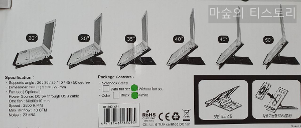 뒷면 역시 노트북 받침대의 유연한 거치 각도에 대한 설명이 있다.